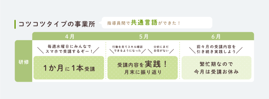 発達ナビ研修教材サービスが自習型のタブレット教材と異なるのは、人との関わり合いの中で、自分の学びやすさ、得意なことを発見できる点にあります。